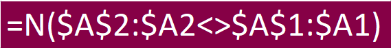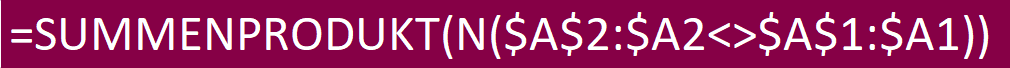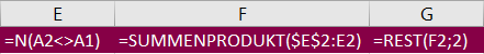 Diese Formel wird genutzt, um zwei Werte zu vergleichen. Es wird abgefragt, ob die beiden Werte unterschiedlich sind -> A2 <> A1. Wenn die beiden Werte gleich sind, gibt die Formel also eine „0“ wieder, da die Frage, ob die Werte ungleich sind, mit Nein beantwortet wird. Ansonsten gibt sie eine „1“ wieder. In unserem Beispiel wären das zwei übereinanderliegende Werte in der Spalte „Kundennummer“.