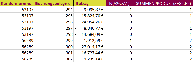 In unserem Beispiel erkennt man, dass die Summe immer eine Zahl höher springt, sobald die Kundennummer sich verändert.