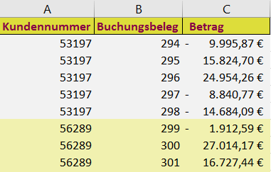 Hierfür stehen in MS Excel zahlreiche Möglichkeiten zur Verfügung. Eine Methode möchte ich Ihnen im Folgenden näher erläutern. Sie ermöglicht einen Farbwechsel innerhalb der Zeile, sobald sich in einer bestimmten Spalte der Inhalt ändert. Dadurch können Blöcke besser erfasst werden. In unserem Beispiel wäre dies der Sprung von einer Kundennummer zur nächsten.