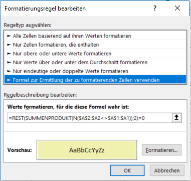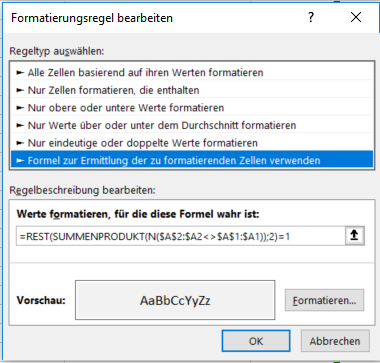 Hierfür verwenden wir die Formel =REST(Zahl; Divisor). Die Ergebnisse aus den beiden ersten Formeln werden durch zwei geteilt. Der Rest ergibt somit entweder eine „1“ bei einer ungeraden Zahl und eine „0“ bei einer geraden Zahl. So erhalten wir beide „WAHR“-Aussagen unserer gesuchten Formel. Entweder ergibt unsere Formel eine „1“, dann wird in unserem Beispiel die Zeile grau gefärbt, oder sie ergibt eine „0“ und dann wird die Zeile in unserem Beispiel grün gefärbt.