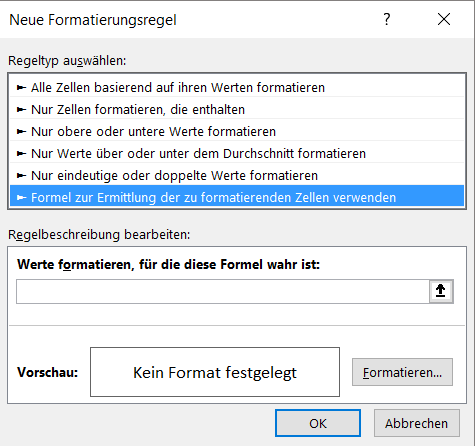 Die Funktion „Bedingte Formatierung“ kann über den Reiter Start unter dem Bereich „Formatvorlagen“ erreicht werden. Es können neben der Auswahl von vordefinierten Regeln auch eigene Regeln erstellt werden. Für den Farbwechsel muss eine „Neue Regel“ erstellt werden. Der Regeltyp ist eine „Formel zur Ermittlung der zu formatierenden Zeile“. Diese Formel muss wahr sein, damit die Formatierungsregel angewendet wird. In unserem Beispiel möchten wir, dass abwechselnd zwei Farben angezeigt werden, sobald sich die Kundennummer ändert. Dafür müssen zwei Regeln erstellt werden.