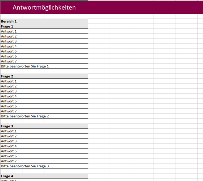 Die Anzahl der Antwortmöglichkeiten kann dabei natürlich Ihren Wünschen angepasst werden. Um den Fragebogen ggf. nochmals für weitere Themen zu verwenden, nutze ich oft eine große Anzahl an Felder, die ich für beliebige Antwortmöglichkeiten füllen kann. Sollte ich diese Felder nicht benötigen, lasse ich diese einfach leer. Für die Benutzerfreundlichkeit steht am Ende meiner Liste immer die sinngemäße Aussage „Bitte beantworten Sie…“. Diese wird als Platzhalter am Ende des Antwortfeldes aufgeführt.