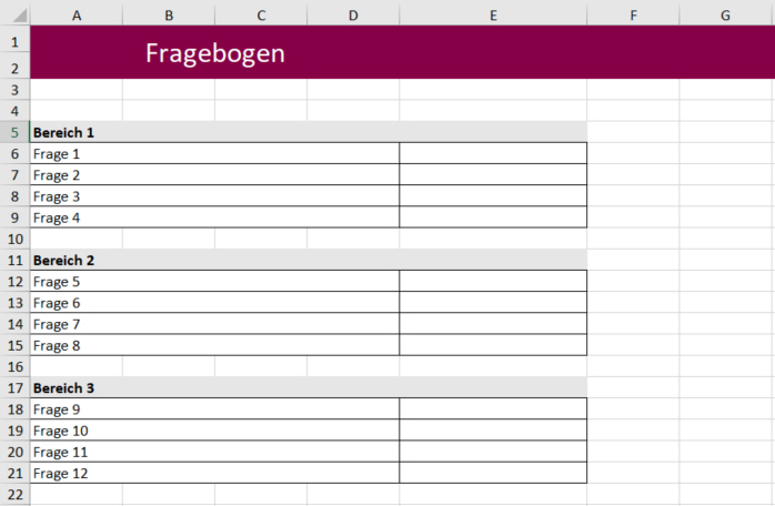 Im ersten Schritt müssen Sie in einem oder mehreren Arbeitsblättern einer Excel-Datei die Fragen bzw. Checkpunkte definieren. Ich habe als Beispiel in dem Arbeitsblatt „Fragen“ insgesamt drei Bereiche definiert mit jeweils vier Fragen.