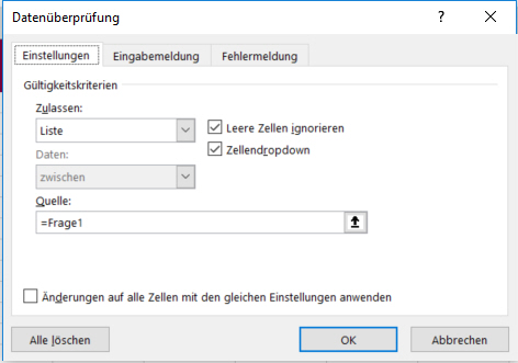 Es öffnet sich ein Fenster. Hier wählen Sie unter Einstellungen > Zulassen den Wert „Liste“ aus und geben als Quelle unseren definierten Namen ein. Im Falle der Antworten zu Frage 1, wäre das „=Frage1“.