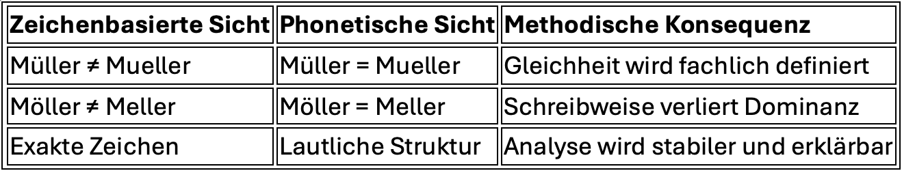 Die Kölner Phonetik verschiebt diese Gleichheitsannahme bewusst vom Schriftbild auf den Klang. Damit verändert sich nicht nur die Gruppierung der Daten, sondern ihre Interpretation. Schreibvarianten verlieren ihre trennende Wirkung, ohne unsichtbar zu werden. Sie bleiben erhalten, dominieren die Analyse jedoch nicht mehr.