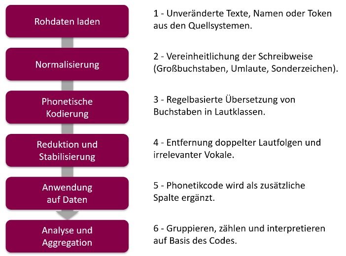 Die Kölner Phonetik bietet hierfür keinen Ersatz für Datenqualität, sondern eine methodische Ergänzung. Sie übersetzt sprachliche Varianten systematisch in eine stabile, lautbasierte Repräsentation. Entscheidend ist dabei nicht der Algorithmus allein, sondern seine konsequente Einbettung in die Datenvorbereitung. Phonetik wird nicht als Analyseergebnis verstanden, sondern als Interpretationsregel, die vor jeder Aggregation greift.