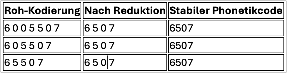 Die folgende Tabelle zeigt, wie aus einer rohen Lautfolge ein stabiler Phonetikcode entsteht.