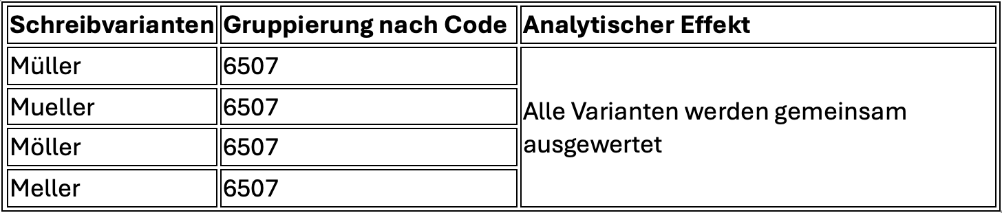 Entscheidend ist auch hier die methodische Zurückhaltung. Die Aggregation nach Phonetikcode ist kein Automatismus zur Zusammenführung von Daten. Sie ist eine analytische Sichtweise, die bewusst gewählt wird. Je nach Fragestellung kann sie genutzt oder bewusst ignoriert werden. Genau diese Wahlmöglichkeit macht den Ansatz kontrollierbar und nachvollziehbar.