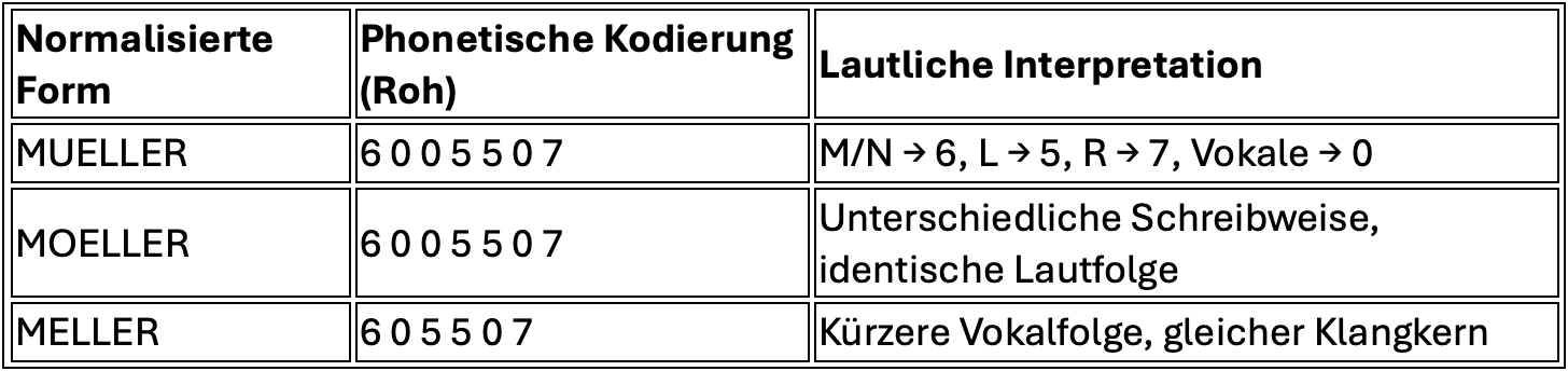 Erst durch diese Normalisierung wird aus „Müller“, „Mueller“ und „Möller“ überhaupt etwas Vergleichbares. Ohne diesen Schritt würde der Algorithmus später zwar formal korrekt arbeiten, aber auf einer instabilen Grundlage. Die Analyse wäre präzise, aber inhaltlich verzerrt.