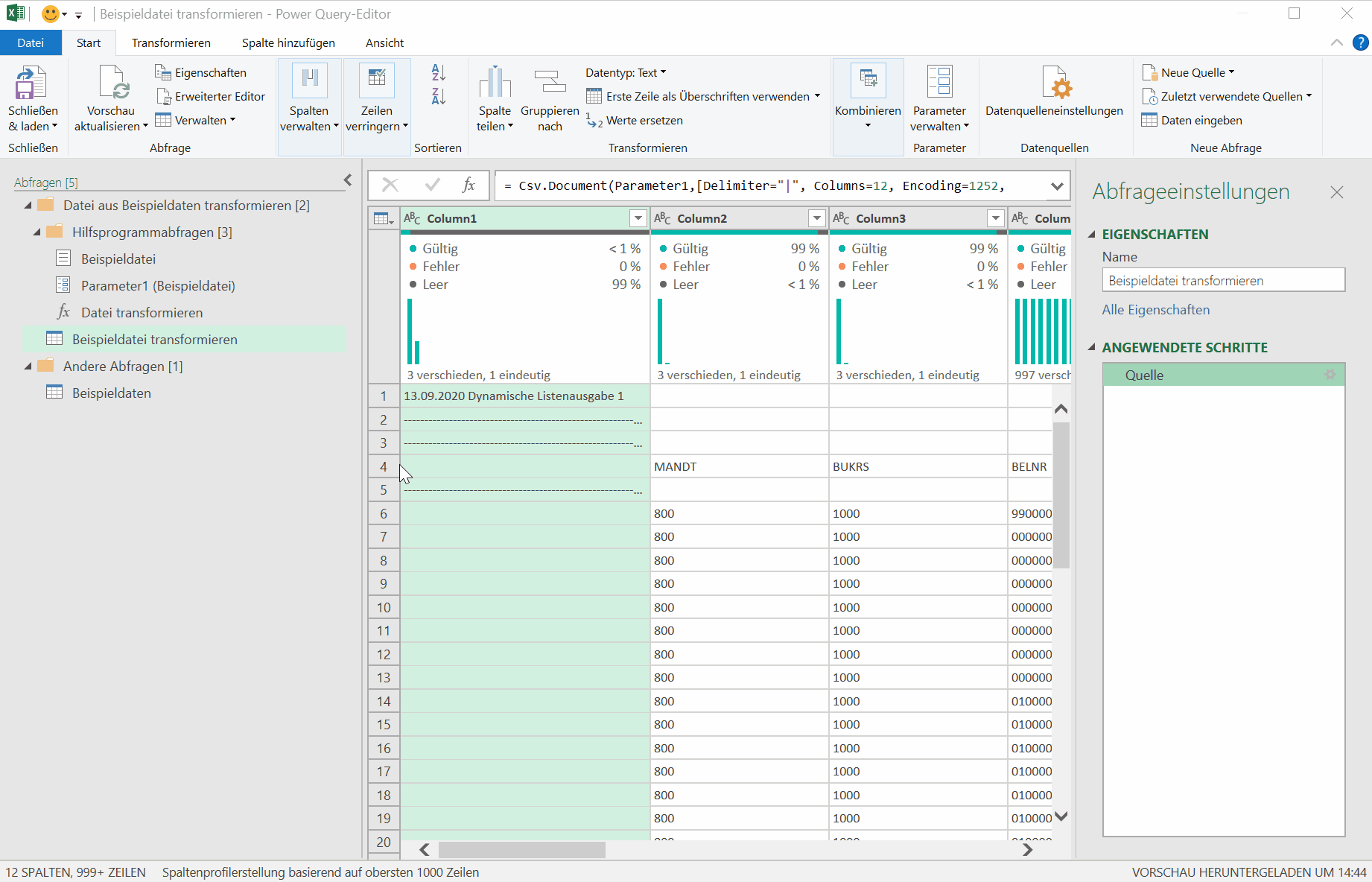Dieses können wir durch die Einstellungen im Ordner „Daten aus Beispieldaten transformieren“ beeinflussen, insbesondere in der Abfrage „Beispieldatei transformieren“.