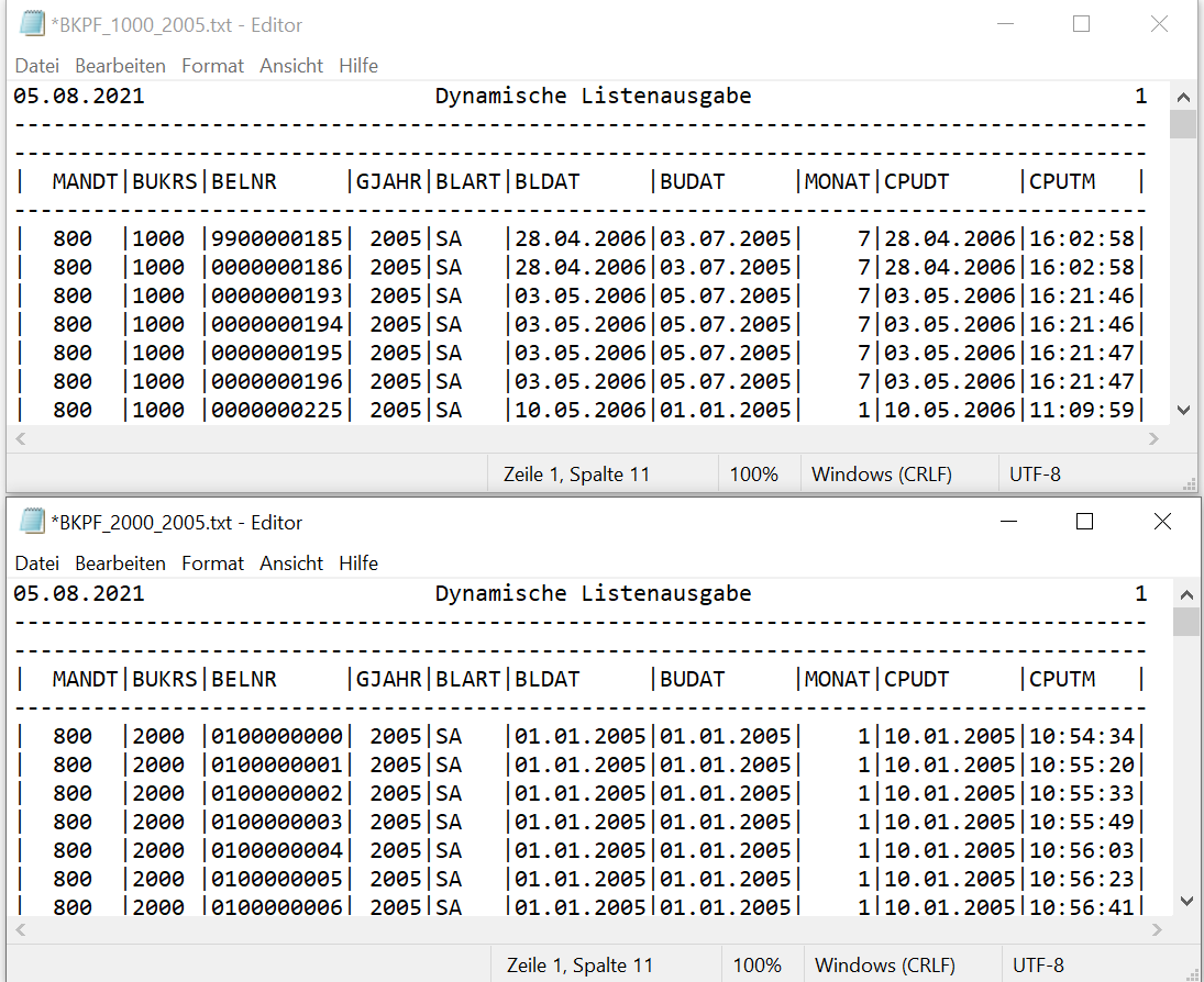Für diesen Blogeintrag habe ich Daten aus einem SAP-Testsystem verwendet. Es handelt sich dabei um die Tabelle BKPF (Buchungsköpfe), die für drei verschiedene Buchungskreise vorliegen. Die Anzahl der Spalten und die Anordnung ist bei allen Dateien gleich. Wäre das nicht der Fall, gäbe es auch eine Lösung. Aber diese werde ich vielleicht in einem anderen Beitrag beschreiben.