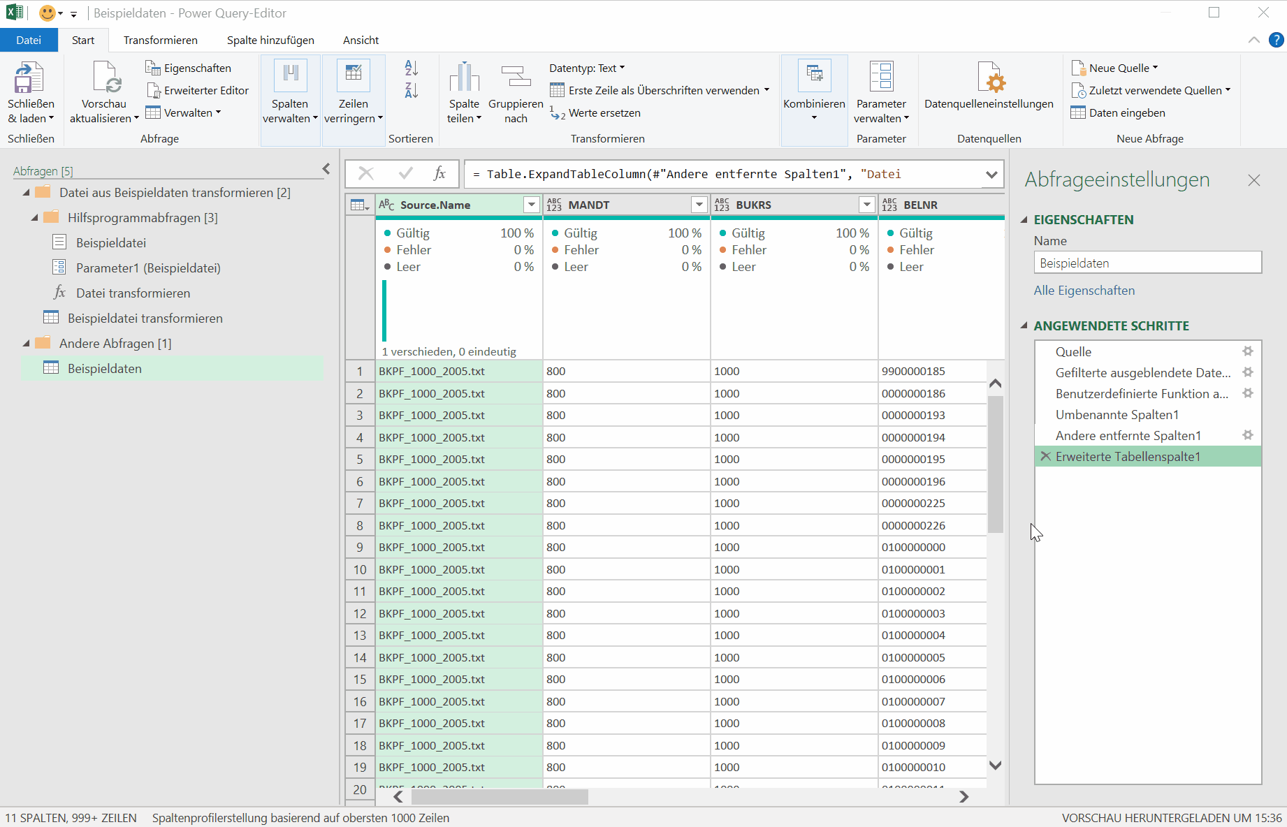 Im Power Query-Editor ist auf der linken Seite die entstandene Struktur zu sehen, die wir zur weiteren Bearbeitung nutzen wollen. Im Ordner "Andere Abfragen" befindet sich eine zusammengesetzte Abfrage aus allen importierten Dateien. In meinem Fall heißt diese „Beispieldateien“, da auch der von mir importierte Ordner so heißt. Diese Tabelle ist das Endergebnis.