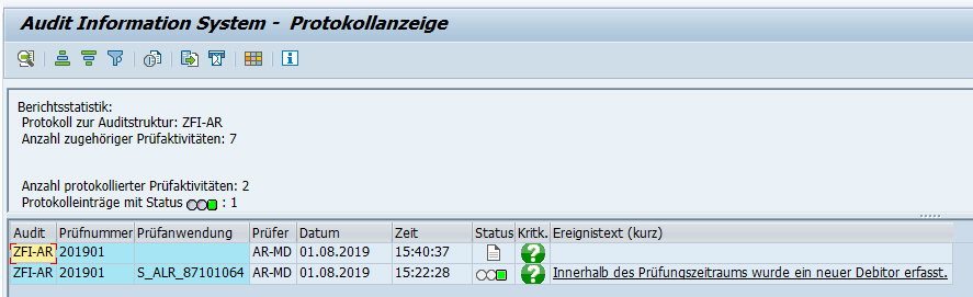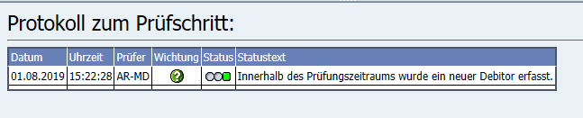 Als Beispiel habe ich den Prüfungsschritt „Neue Debitoren für BuKrs im Prüfungszeitraum“ ausgeführt. Ein Debitor wurde innerhalb des Prüfungszeitraums angelegt. Dies habe ich innerhalb der Anmerkung angegeben, den Prüfstatus „Prüfung erfolgreich“ mitgegeben und den Eintrag gespeichert. Der Text erscheint jetzt in dem Protokoll.