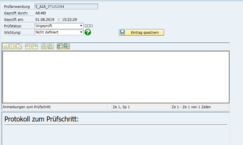 Klickt man (mit Doppelklick) auf den Kurztext eines Prüfschrittes, öffnet sich im rechten Bereich eine neue Sicht, die die Möglichkeit bietet, verschiedene Informationen zu hinterlegen. Dies beinhaltet den Prüfstatus, die Gewichtung, die Anmerkung zum Prüfschritt und ein Protokoll, welches durch das SAP®-System erstellt wird.