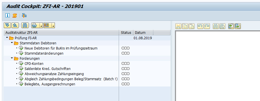 Über das Icon „Ausführen“ (grünes Häkchen mit Uhr) wird direkt die Transaktion aus dem Audit Cockpit aufgerufen. Es öffnet sich ein neues Fenster, sodass parallel zur Prüfung die Dokumentation erfolgen kann.