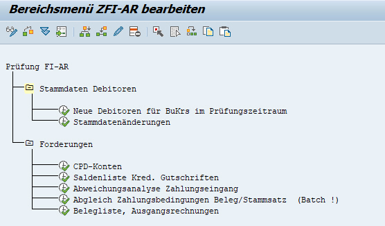 Dennoch möchte ich Ihnen im nächsten Schritt kurz erläutern, wie ein Bereichmenü aufgebaut wird. Als Beispiel habe ich das Bereichsmenü ZFI-AR angelegt, zur Prüfung von Debitoren.
