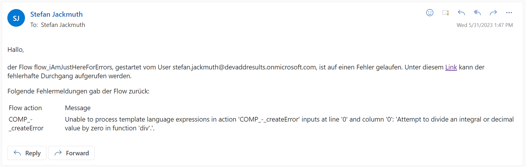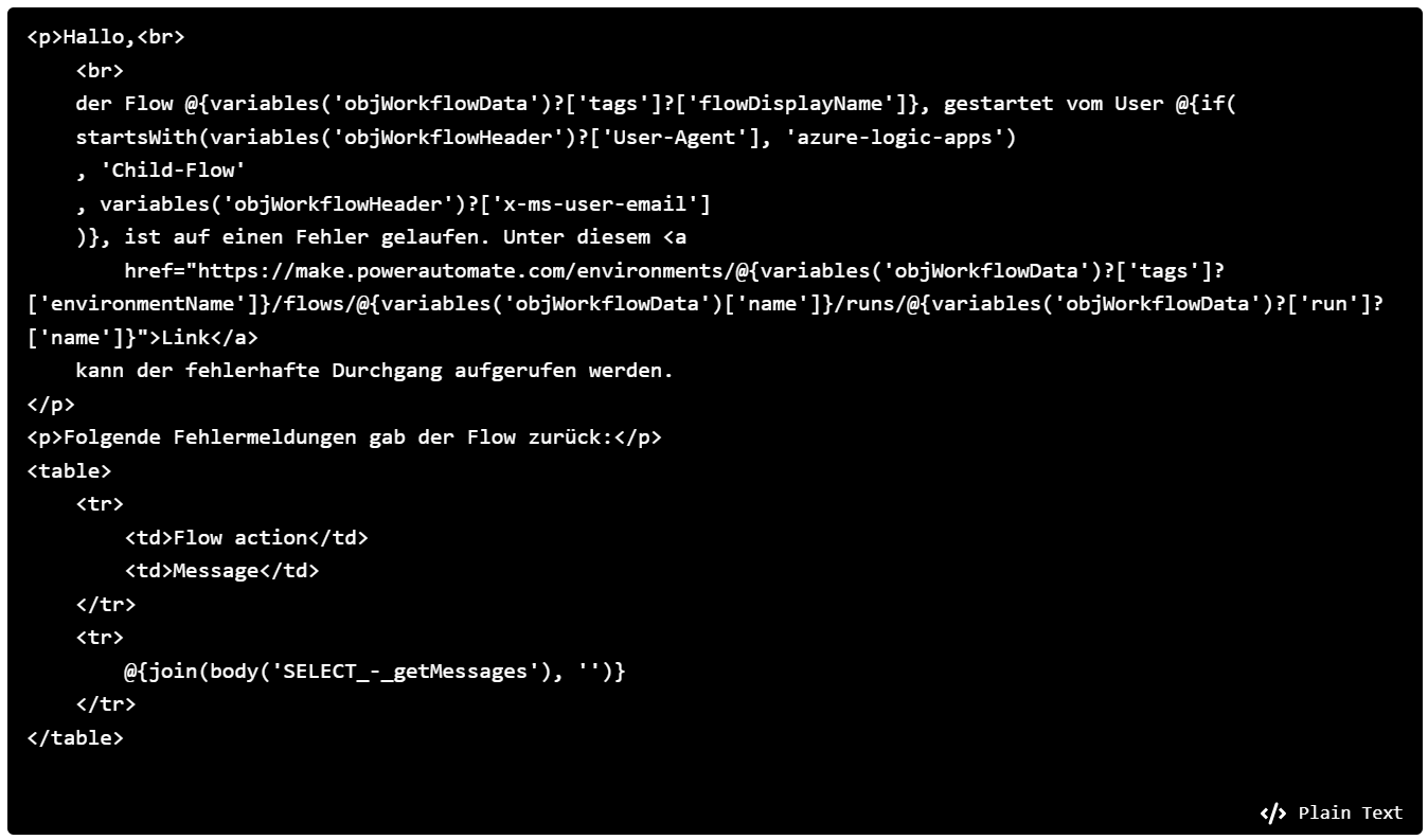 But let's take the following scenario: The flow fails, e.g. a third party service is out of order. This can happen and is reported accordingly in the flow via an error message to the action. Should the application maintainers really have to go to the flow in such cases? No. For this we have the variable result('SCOPE-main').