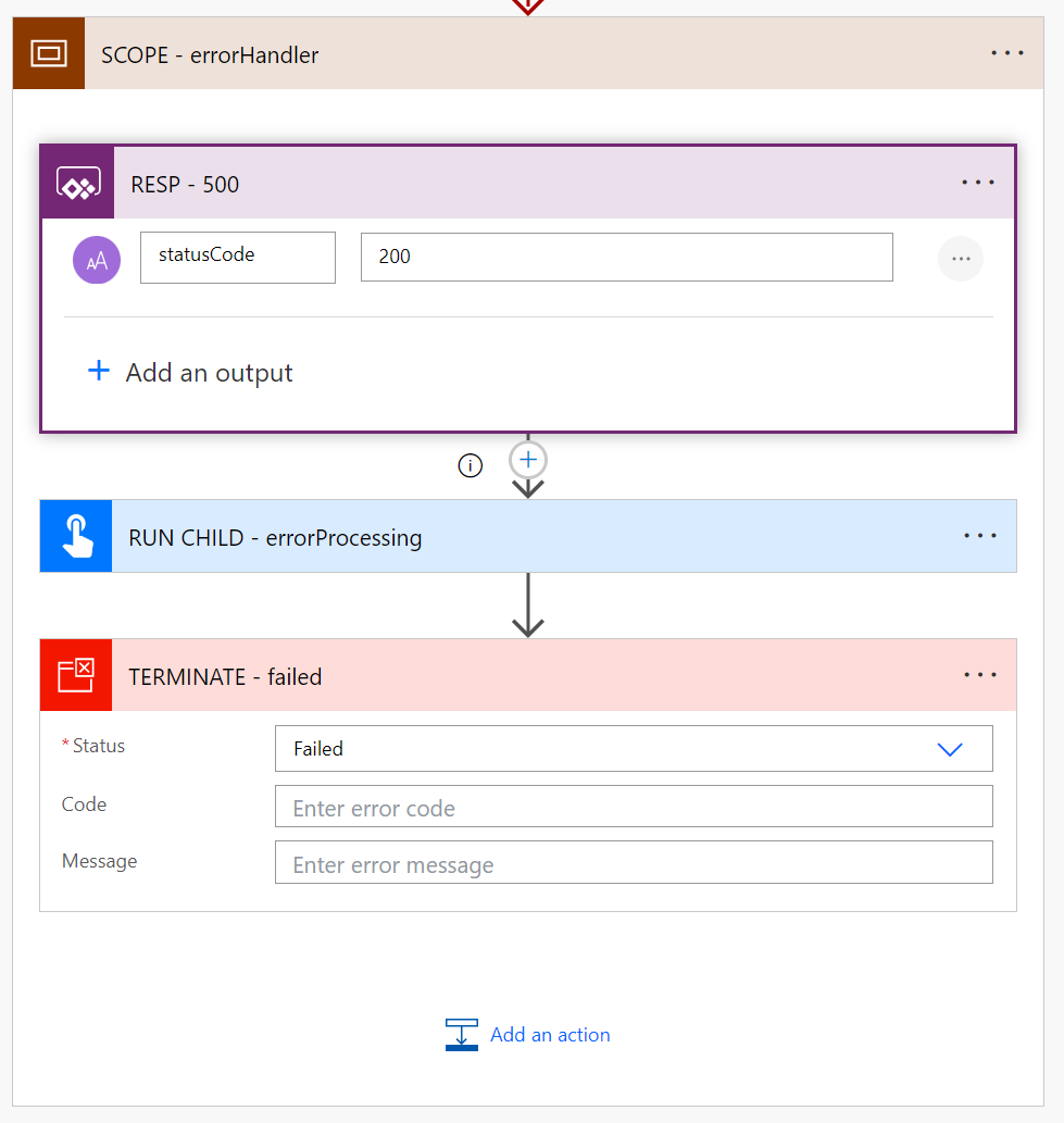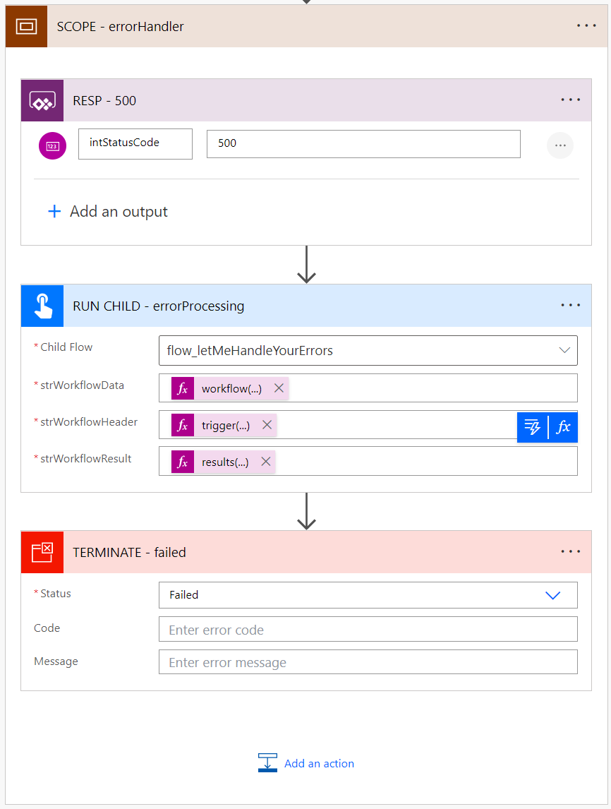 Two actions are placed after the scope: the response action that returns the statusCode 200 (i.e. success) and the scope "SCOPE - errorHandler" - however, this only runs in the event of an error. A response action that returns the statusCode 500 (i.e. error) and then calls a child flow. This child flow takes care of the appropriate processing of the error.