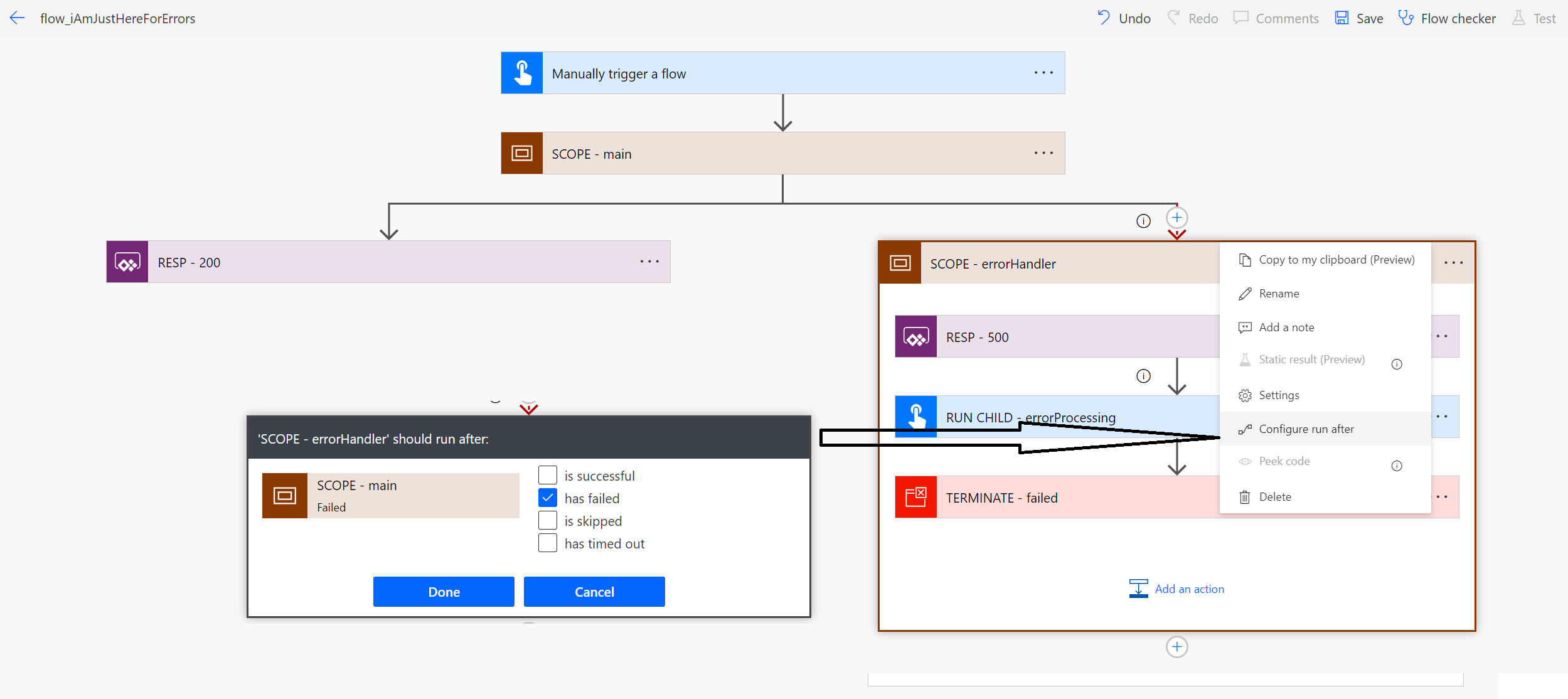 Another little thing is hidden in the conditions when the action "RUN CHILD" should be triggered: Also when the action "RESP - 500" is skipped. It could be that there are reasons in which no feedback needs to be given to an app or flow. However, we still want our errorProcessing to be triggered, of course.