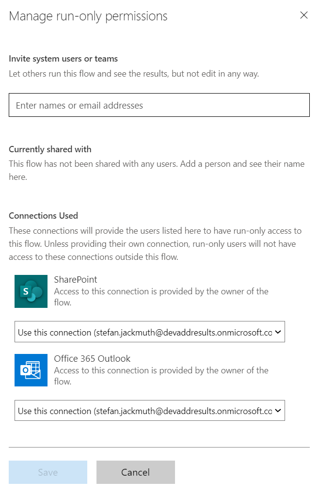 In our case, this is very helpful, as it means that users do not need any permissions to the SharePoint list or shared mailbox they are using. A technical account comes in handy in this case and leads me almost seamlessly to the last, optional requirement.