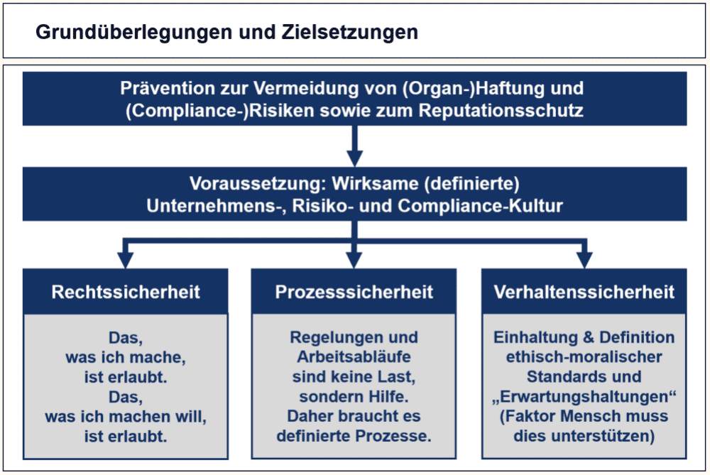 Demzufolge kann es keine effektiven Compliance- und Risikomanagementsysteme geben, wenn es nicht zugleich eine wirksame und durch alle Mitarbeiter „gelebte“ Umsetzung der vom Unternehmen vorgegebenen und gewünschten Prozesse sowie ethisch-moralischer Standards und „Erwartungshaltungen“ gibt. Eine wesentliche Voraussetzung ist dabei die Festlegung von konkreten unternehmensspezifischen, verpflichtenden „Kulturzielen“ zur Gewährleistung von Rechtssicherheit, Prozesssicherheit sowie Verhaltenssicherheit. An diesen definierten Zielen können die Unternehmenskultur und das Verhalten aller Mitarbeiter bewertet und Abweichungen durch geeignete Maßnahmen entgegengesteuert werden.